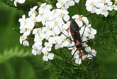 The white yarrow is beginning to bloom, also. I didn't notice until I uploaded the picture that one of the blossoms has a visitor.